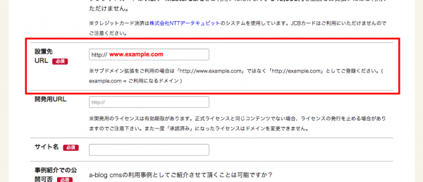 a-blog cmsのスタンダートライセンスを購入するとき、設置先URLに注意。www.は必ずつけること。